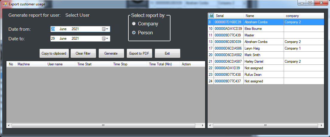 System logs each use of the card (wheter the card was allowed or rejected) and later on administrator can export reports of the time used for each device for each card.